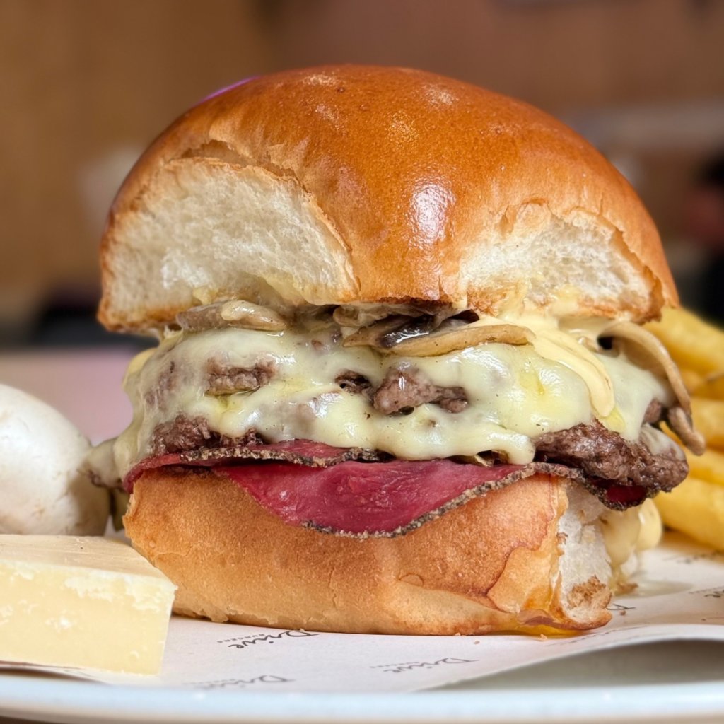 Lanýžový mayo, hovězí ořech od Chovanečka, 2xsmash hovězí s goudou, žampiony a Gran Moravia parmezán:)