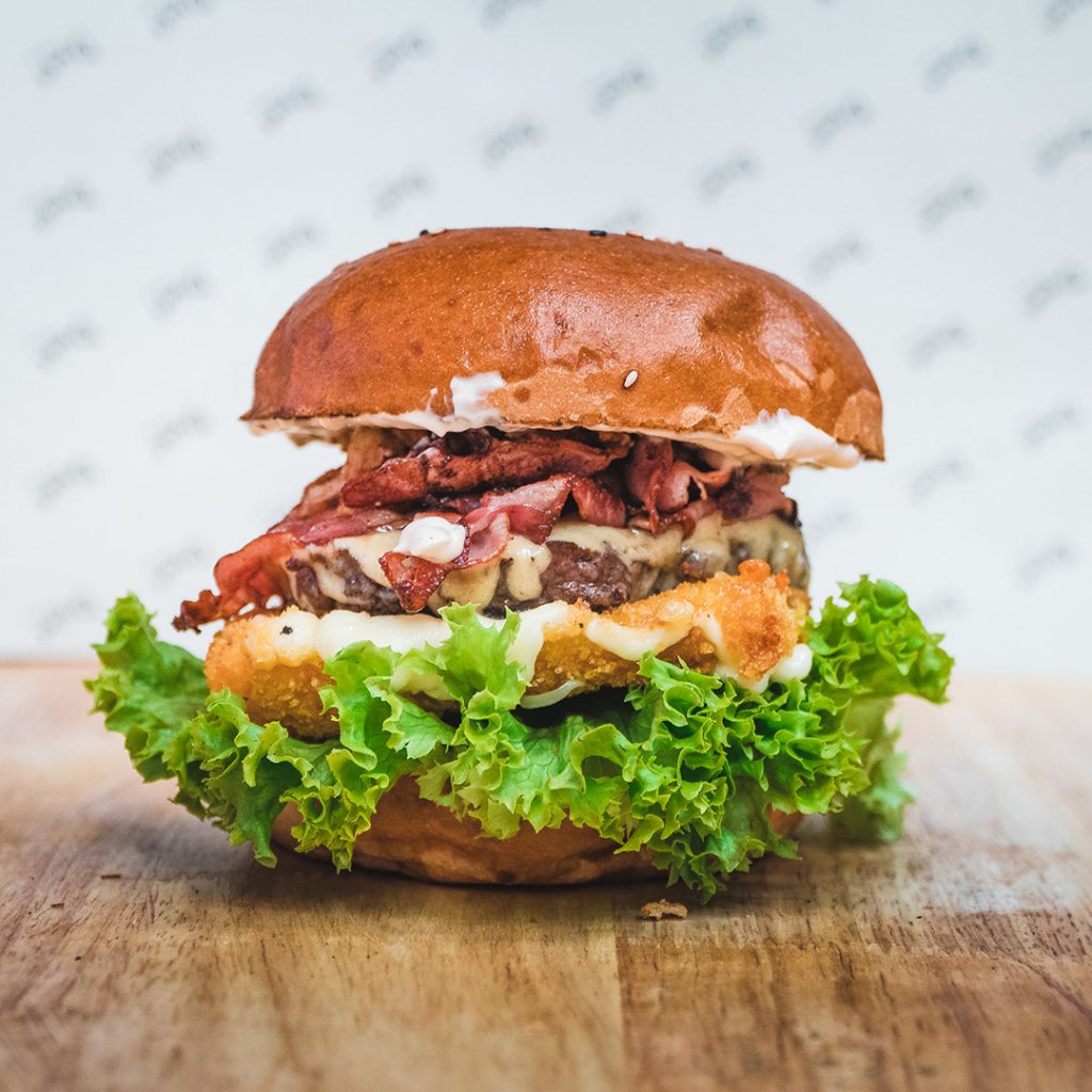 Smažená gouda posazená na lolo salátu se 100% hovězím s čedarem, slaninou, drive majonéza na našich nadýchaných houstičkách je samozřejmostí!